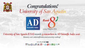 University of San Agustin Ranks 8th in the Philippines in AD Scientific Index 2026, with 53 Scientists Recognized