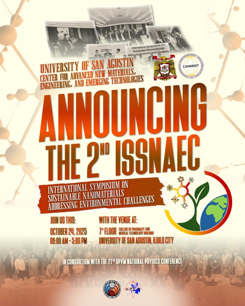 The University of San Agustin, through the Center for Advanced New Materials, Engineering, and Emerging Technologies (CANMEET), is honored to host the 2nd International Symposium on Sustainable Nanomaterials Addressing Environmental Challenges (ISSNAEC) on October 24, 2025.
