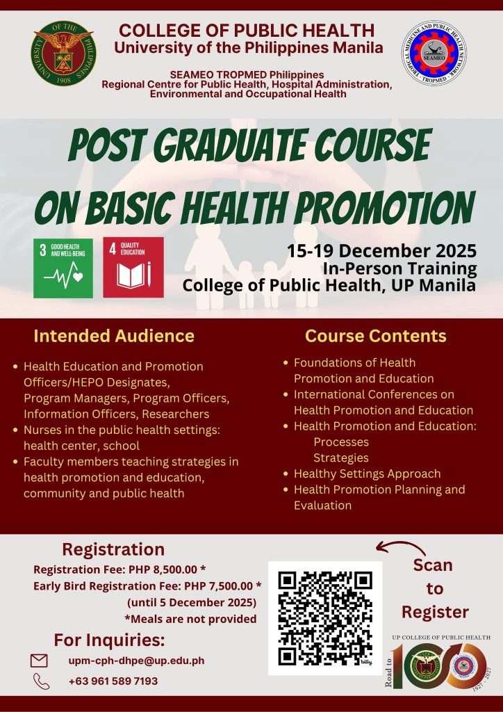 Fr. John Louis S. Ricamora, OSA, recently participated in a Postgraduate Course on Basic Health Promotion hosted by the College of Public Health at the University of the Philippines Manila. The course took place from December 15 to 19, 2025, and covered a wide range of essential concepts and strategies crucial to health promotion and education.