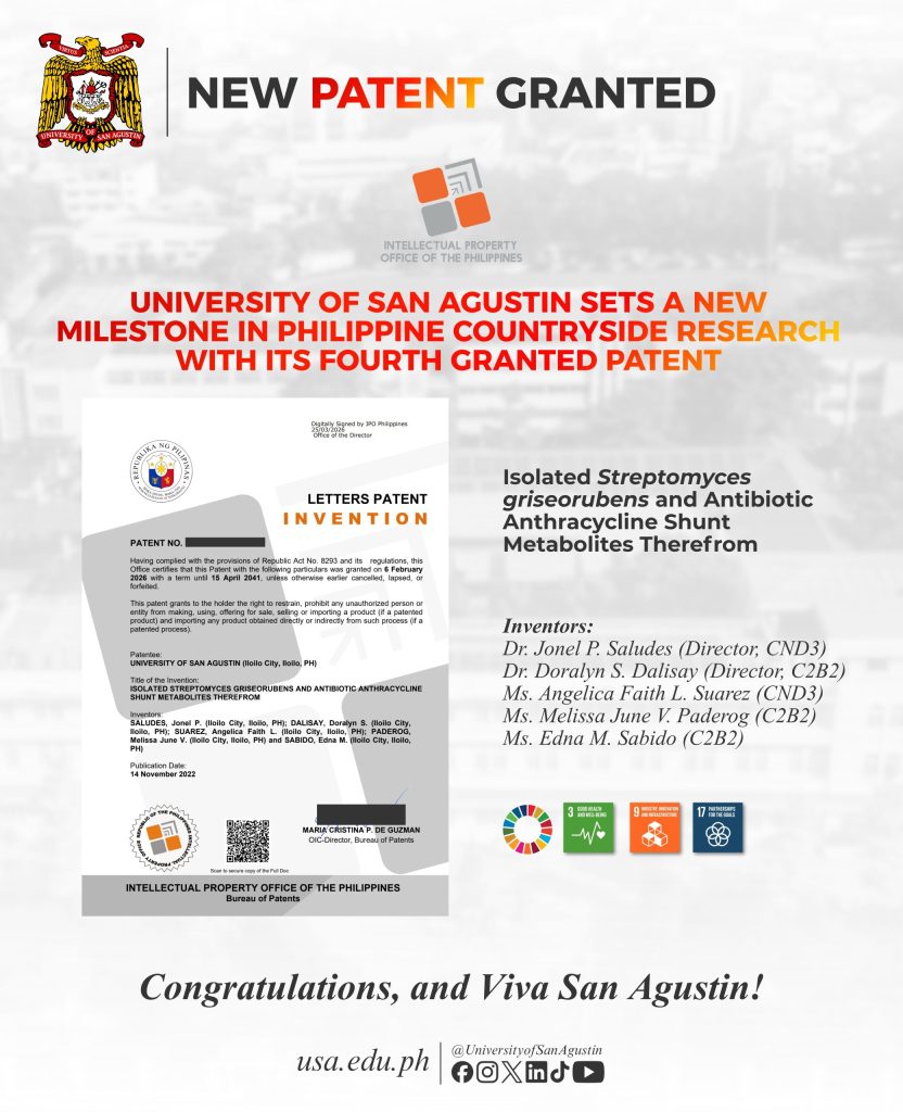 A significant milestone in Philippine scientific research has been achieved as the Intellectual Property Office of the Philippines (IPOPHL) officially granted a 4th patent for the groundbreaking antibiotic discovery by researchers from University of San Agustin.