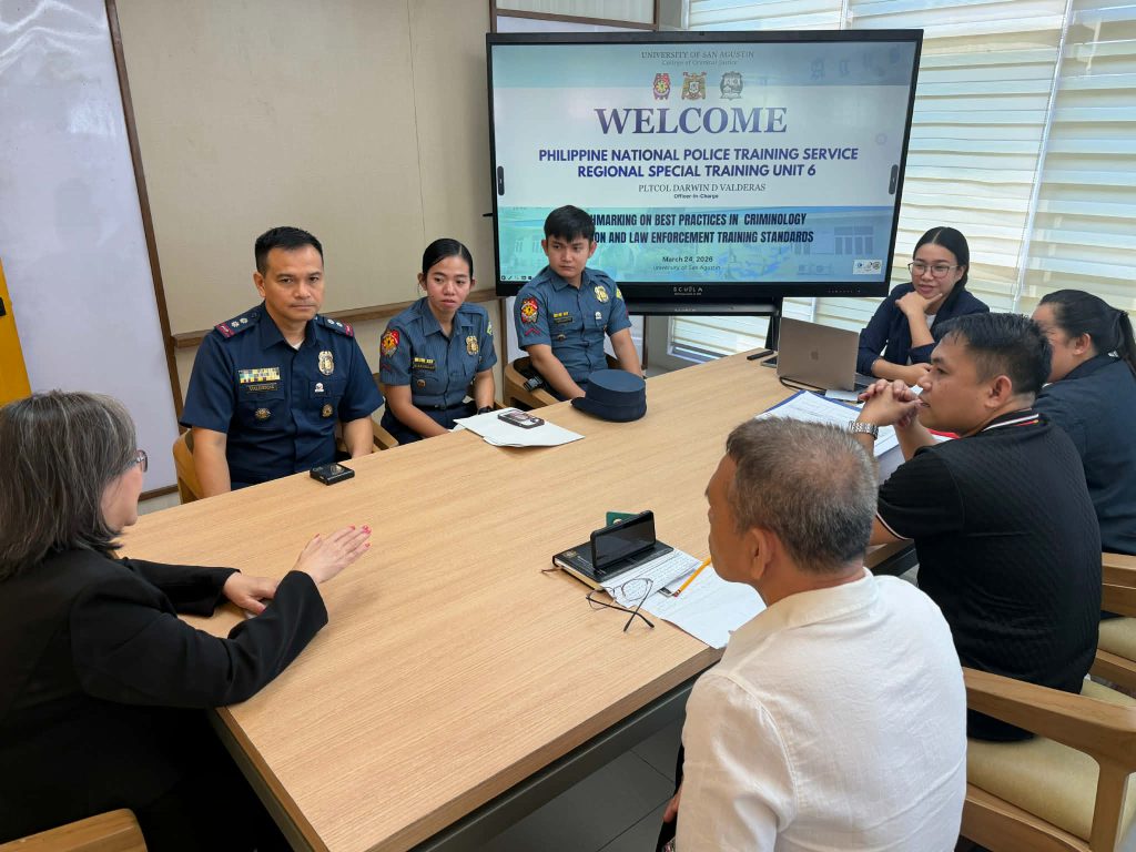 The College of Criminal Justice of University of San Agustin welcomed the Philippine National Police – Regional Special Training Unit 6, led by PLTCOL Darwin D. Valderas, for a benchmarking activity held on March 24, 2026, with the full support of the Vice President for Academic Affairs, Dr. Regina Aileen May Vergara.