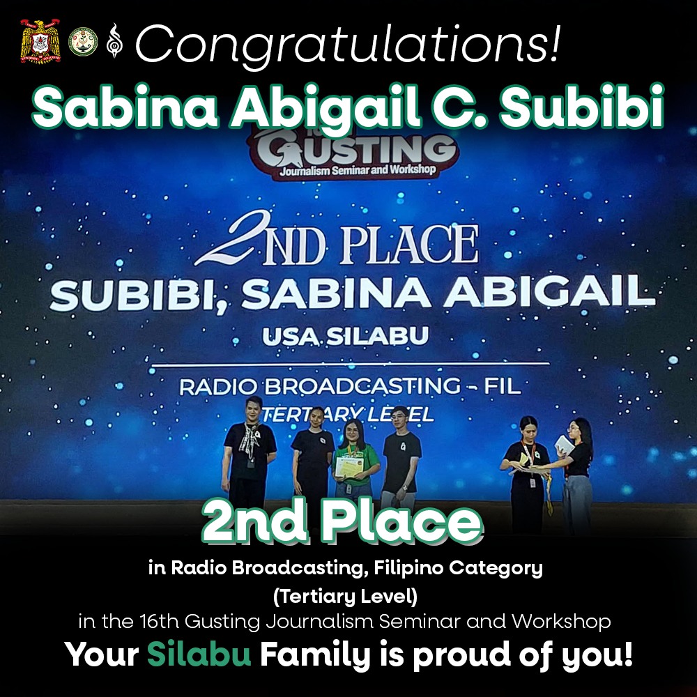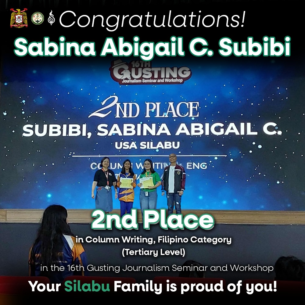 The entire SILABU community stands with immense pride in celebrating our very own staff reporter, Sabina Abigail C. Subibi for her outstanding double victory during the 16th Gusting Journalism Seminar and Workshop by the USA Publications held this November 29-30, 2025 at the University of San Agustin.