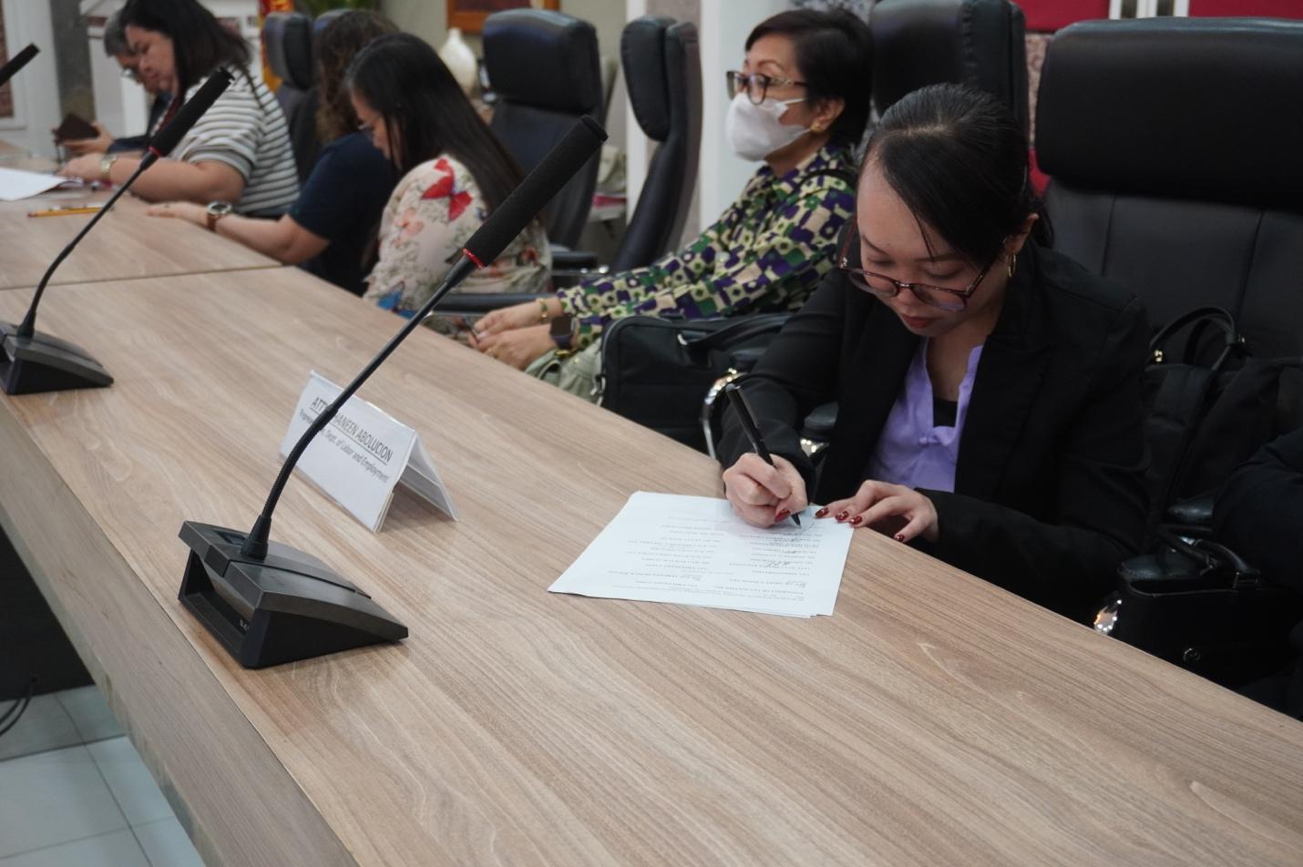 Atty. Chaneen Abolucion, a representative from the Department of Labor and Employment signs the CBA as witness.