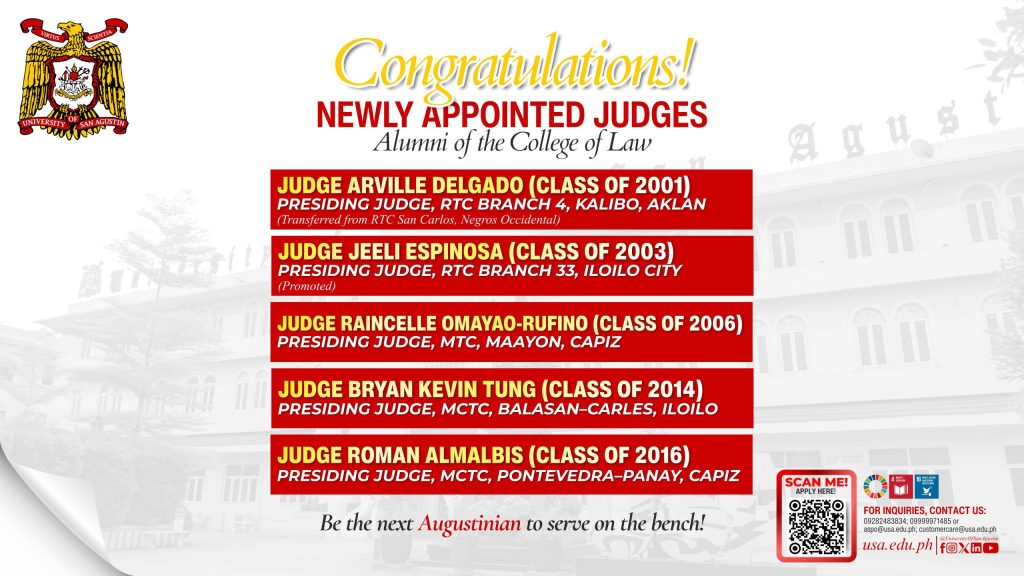 The University of San Agustin (USA) College of Law proudly announces the recent judicial appointments of five distinguished alumni—an inspiring testament to the institution’s enduring mission of forming principled leaders for the Philippine judiciary.