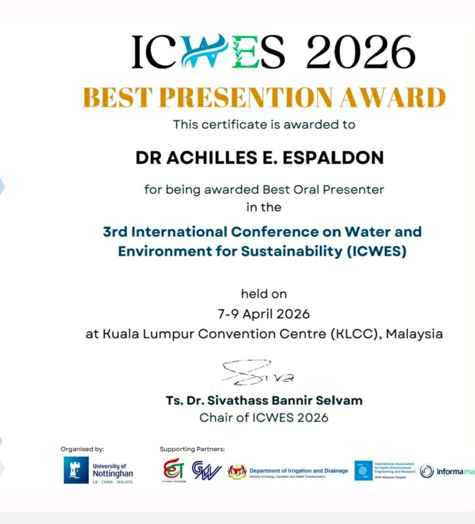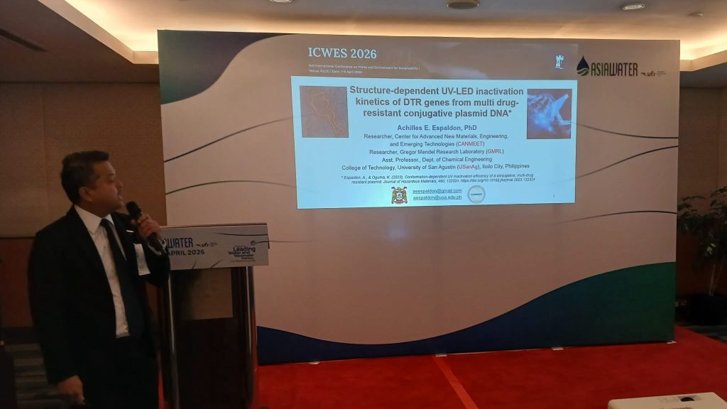 The University of San Agustin – Center for Advanced New Materials, Engineering, and Emerging Technologies (CANMEET), represented by Dr. Achilles E. Espaldon, PhD, a CANMEET researcher, Gregor Mendel Research Laboratory researcher, and Assistant Professor of Chemical Engineering, was awarded Best Oral Presenter at the 3rd International Conference on Water and Environment for Sustainability (ICWES).