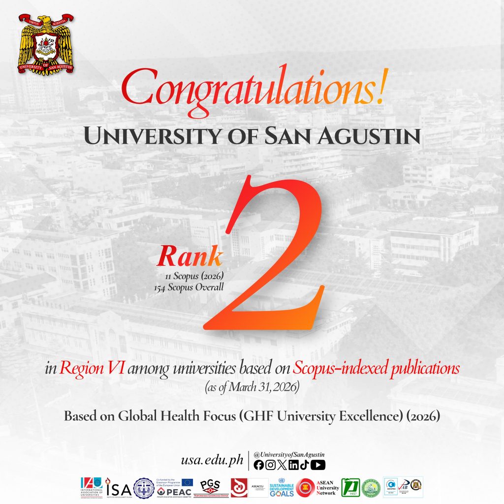 The University of San Agustin proudly ranks No. 2 in Region VI among universities based on Scopus-indexed publications, as of March 31, 2026, based on results released under the Global Health Focus (GHF University Excellence) framework (2026).