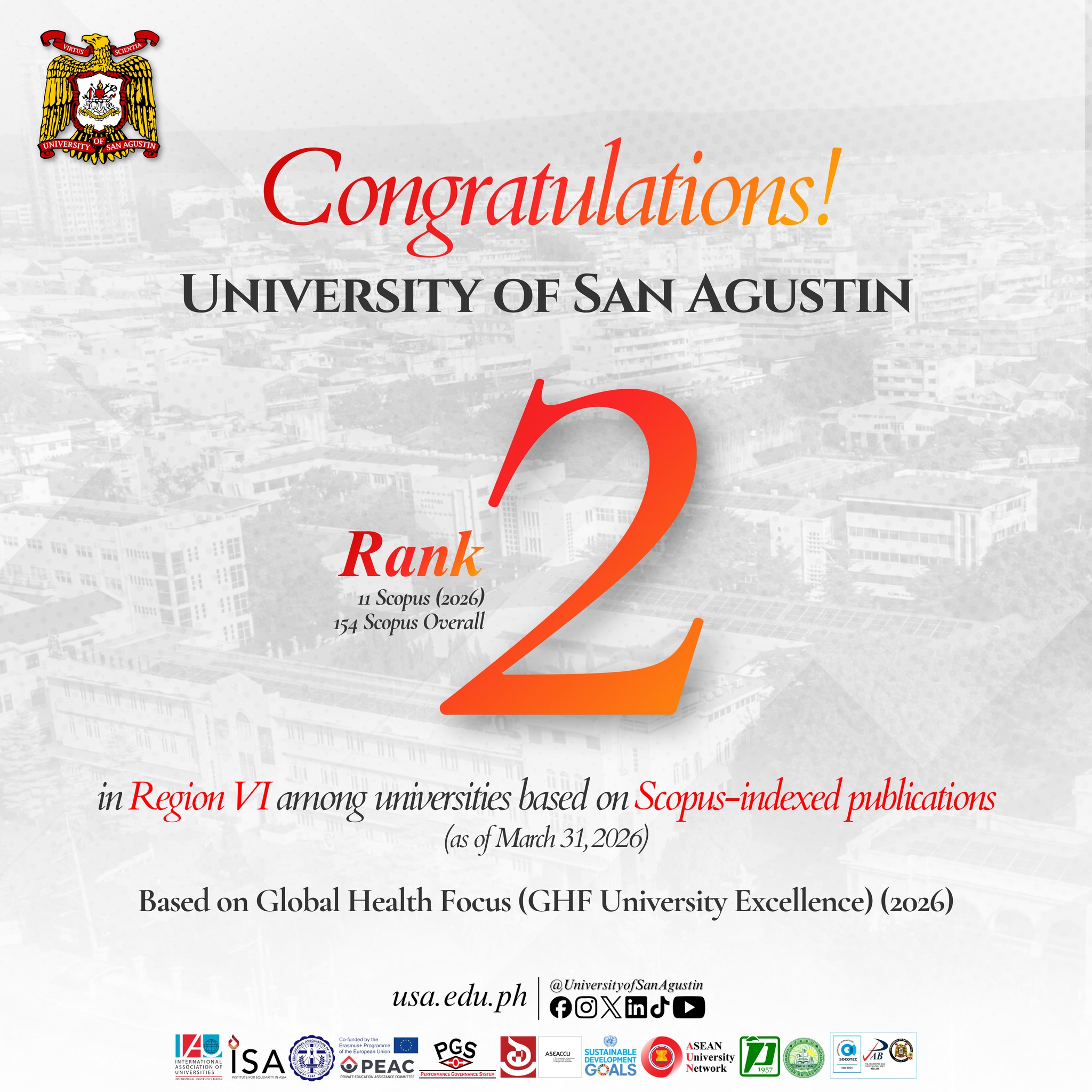 The University of San Agustin proudly ranks No. 2 in Region VI among universities based on Scopus-indexed publications, as of March 31, 2026, based on results released under the Global Health Focus (GHF University Excellence) framework (2026).