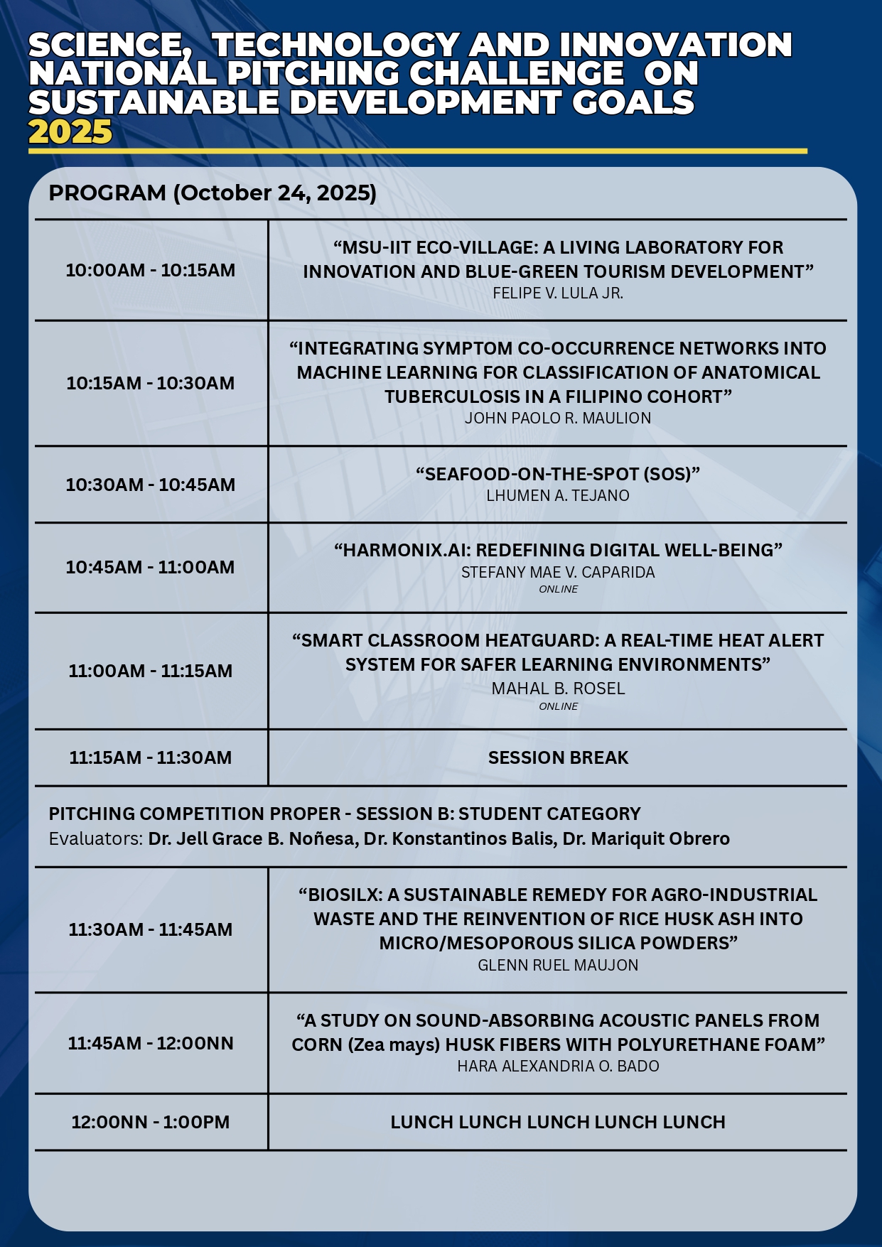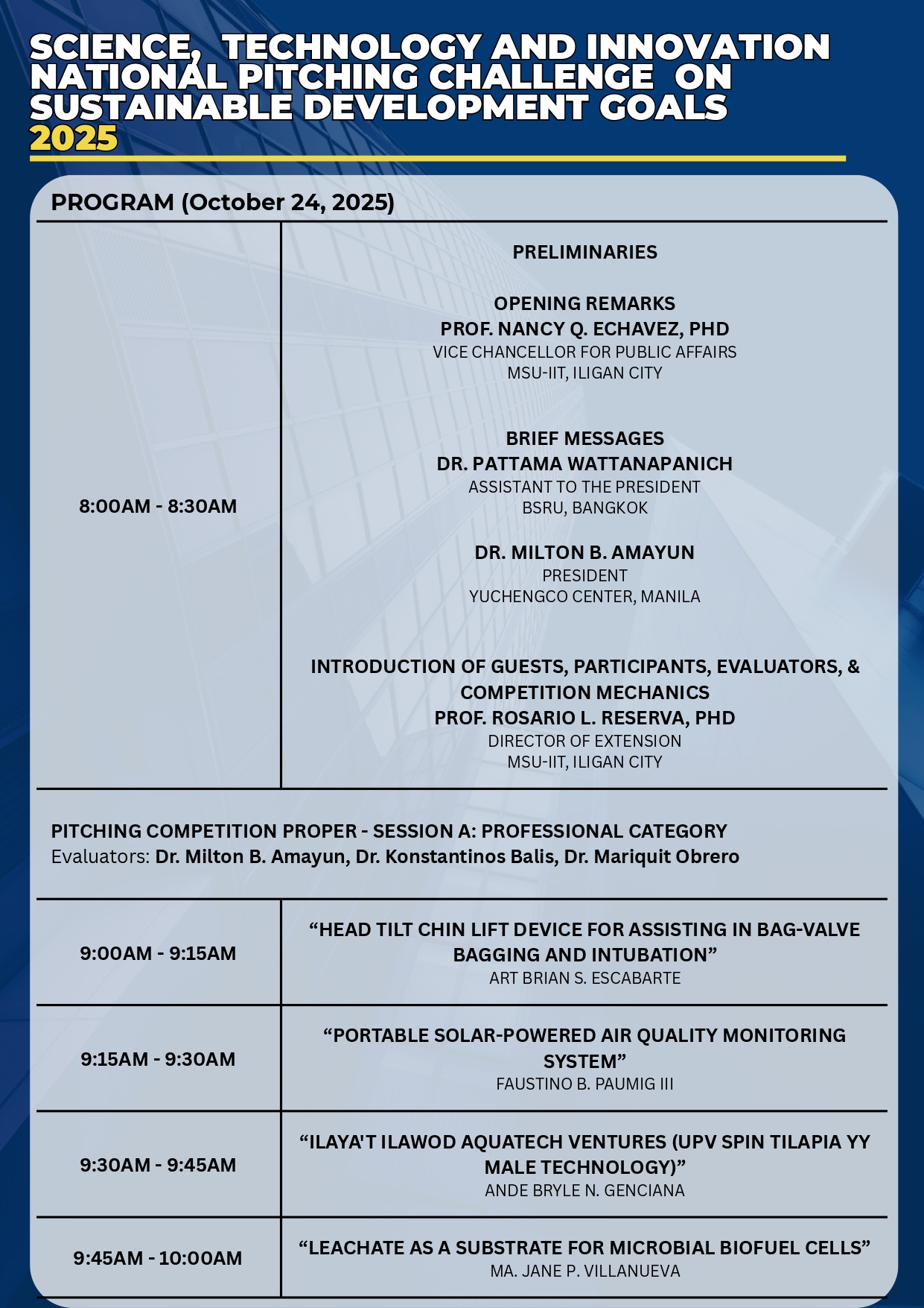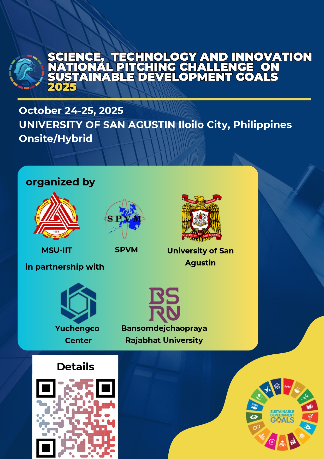 We congratulate Ma. Jane P. Villanueva, MILE, MPH, LPT, RN, our Public Health Nursing Coordinator, for actively participating during the recently concluded Science, Technology, and Innovation National Pitching Competition on Sustainable Development Goals (SDG) 2025 held at the University of San Agustin, Iloilo City, on October 24, 2025.